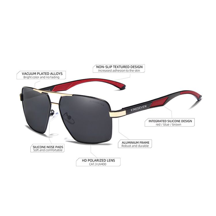 KINGSEVEN квадратни алуминиеви магнезиеви мъжки авиационни слънчеви очила 7719 са изработени от висококачествена алуминиева сплав, която е твърда и не се деформира лесно. Вакуумното покритие има ярък цвят и не избледнява; Силиконови подложки за нос, меки и удобни, стабилни и не се плъзгат; KINGSEVEN оригинален дълъг силиконов защитен калъф, добавящ текстура против приплъзване, за да се увеличи адхезията към кожата; Сребро, злато, метал с цвят на пистолет Цветът и черната рамка се комбинират, за да създадат свеж и модерен визуален ефект; поляризираната леща с висока разделителна способност CAT.3 UV400 е против падане, експозиция, UV, а дизайнът на вътрешния син филм може да увеличи защитния ефект на лещата и да я направи по-красива. Към този продукт добавихме поляризирани цветни лещи, жълти лещи с функция за нощно виждане и лещи с фотохромна функция, които могат да се използват както на закрито, така и на открито.